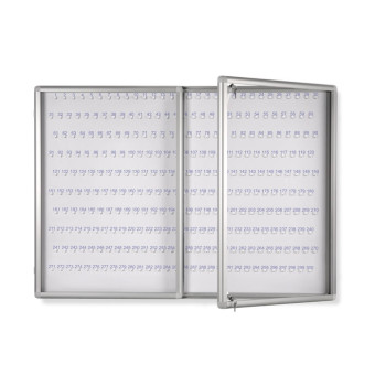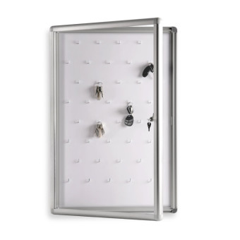 Tym razem modyfikacja polegała na zmianie wymiarów gabloty. Dodatkowo ramy zostały pomalowane na czarny kolor, co nadało całości nowoczesny i elegancki wygląd. Gablota na zdjęciu ma wymiar 50x70cm i posiada 52 haczyki na klucze.